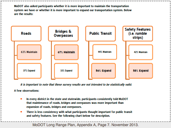MoDOT surveyed over 12,000 Missourians as part of the Missouri on the Move listening sessions, who clearly indicated that the priority is on maintaining, not expanding, the existing system: